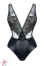 Nathalie – elegant and sophisticated, exposing the beauty of the female teddy. It seduces and allows to seduce in any situation. Sexy bodysuit with a high waist. In the front, the top is made of a decorative black and gold lace combined with a transparent black mesh, effectively and sexily displaying the neckline. At the back, the shape of the naked back intrigues with the long, vertical cut. The bottom of the bodysuit is made of black material of a “wet look” type, which perfectly adjusts to the body, and the high waist and flashes of light on the black material give the hips and buttocks an exceptionally appetizing character. The additional advantage of the Nathalie teddy is also the optical elongation of the legs and whole body. This effect, combined with the appetizing buttocks and the sensual neckline will make you emanate a refined but tasteful sex appeal.