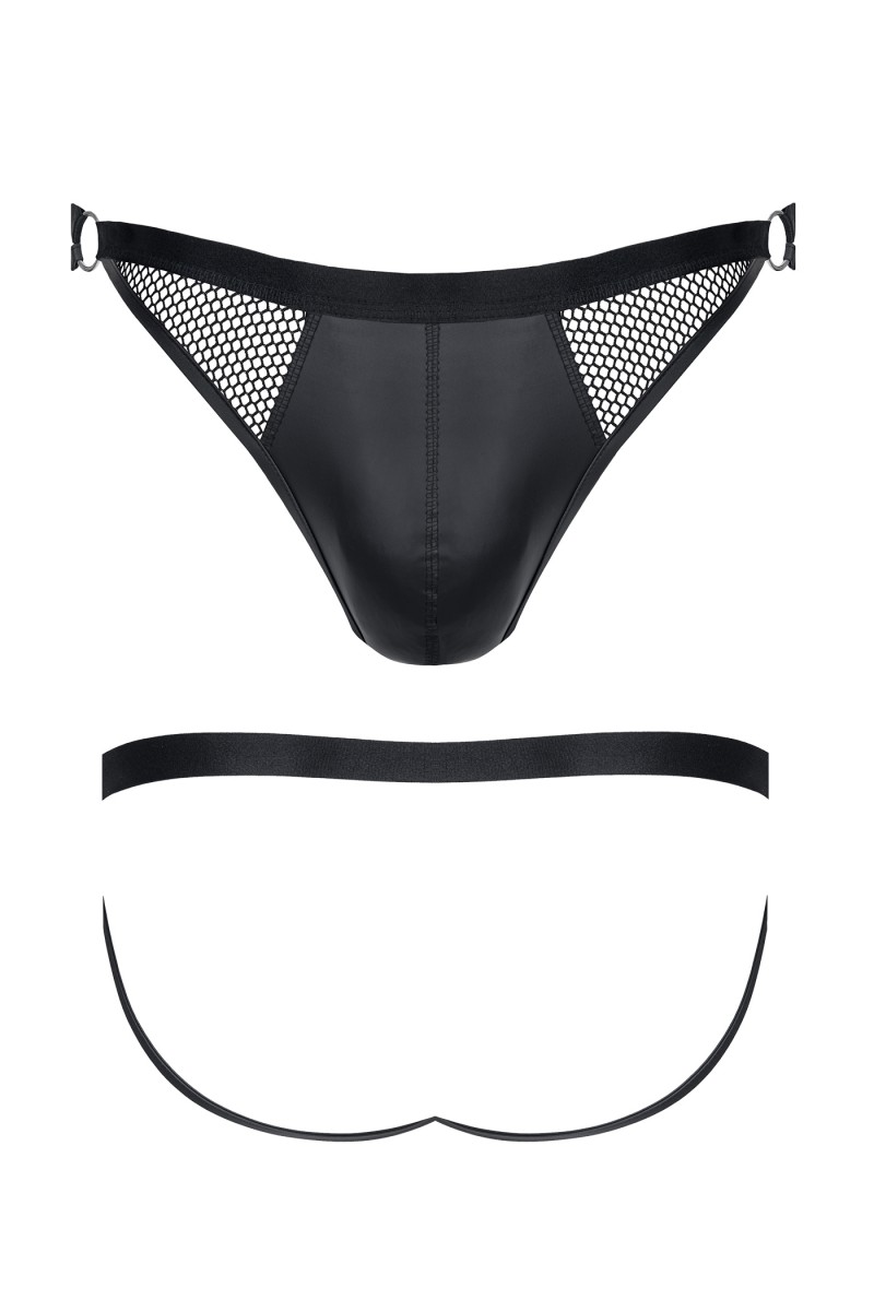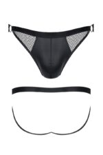 The jockstrap is a thong with an open back. It has decorative, vertical inserts with elastic checkered at the front and elastic material. The jockstrap is nice to touch and has a wide elastic band around the circumference. It has a BigBoss pocket and strengthening sewing