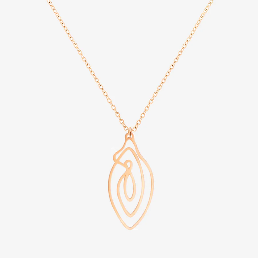 Made from rose gold plated stainless steel, the vulva is depicted as a discreet line drawing, making it an understated yet meaningful accessory.